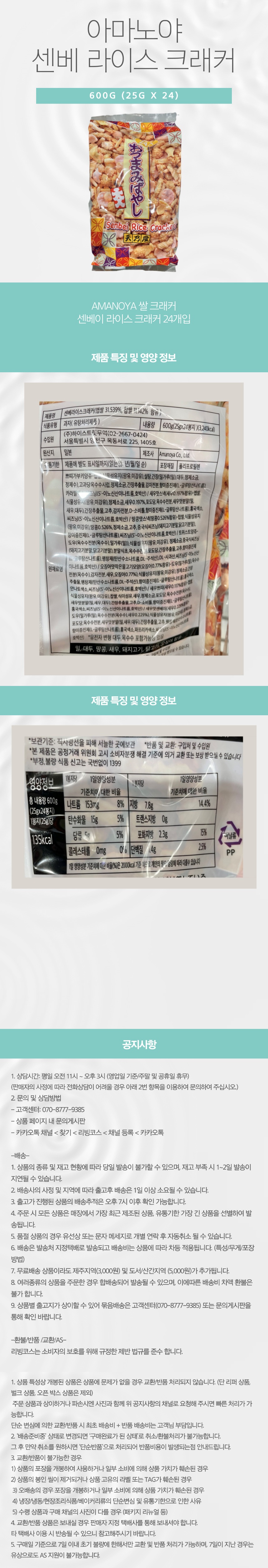 - 역사깊은 일본쌀과자 전문기업인 아마노야 쌀 크래커는 모양마다 각기다른 고소하고 짭잘한 여러가지 맛의 스낵으로 골라먹는 재미가 있습니다. 작게 개별 포장(24봉)이 되어있어 편리하게 언제든지 부담없이 즐기실 수 있습니다.
