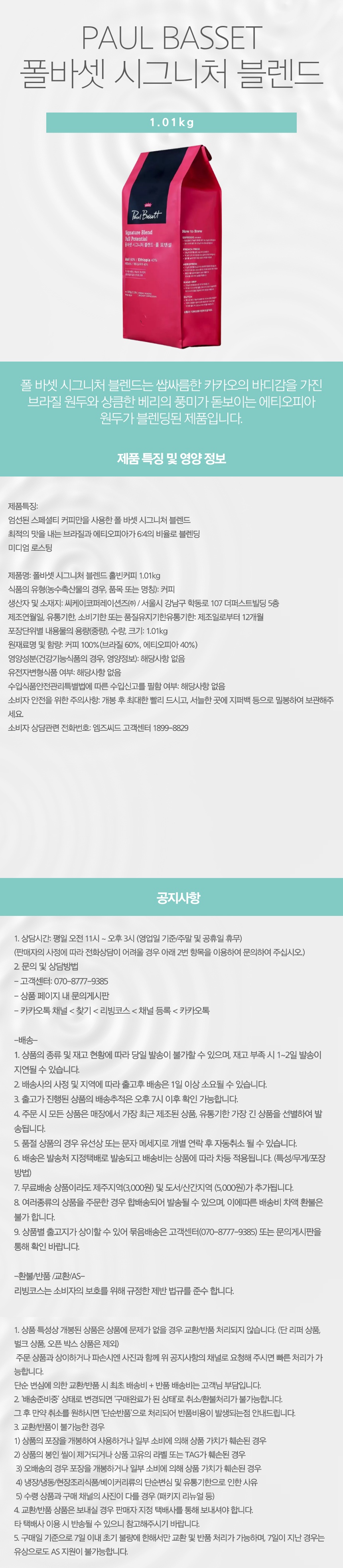 폴바셋 시그니처 블렌드 홀빈커피 1.01kg