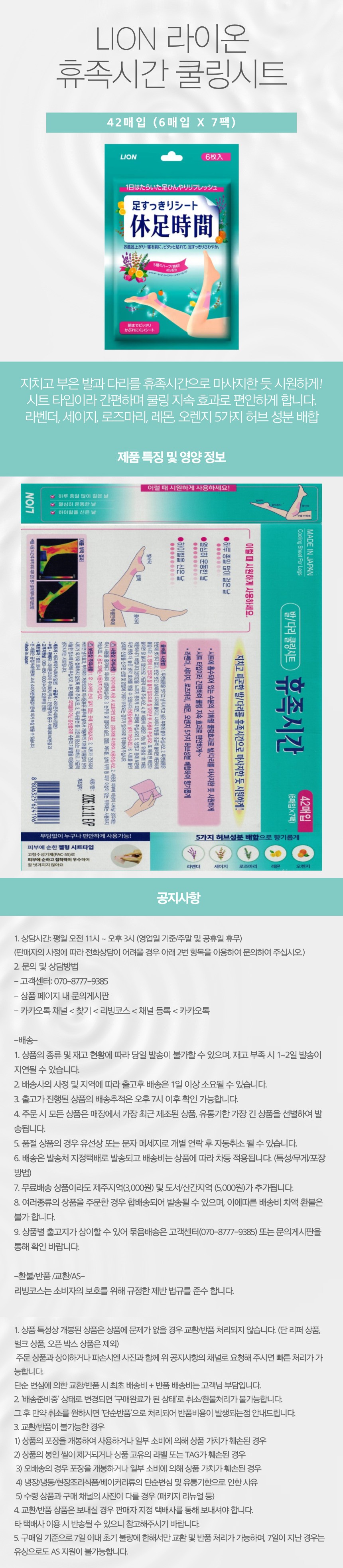 LION 라이온 휴족시간 쿨링시트 42매 COS