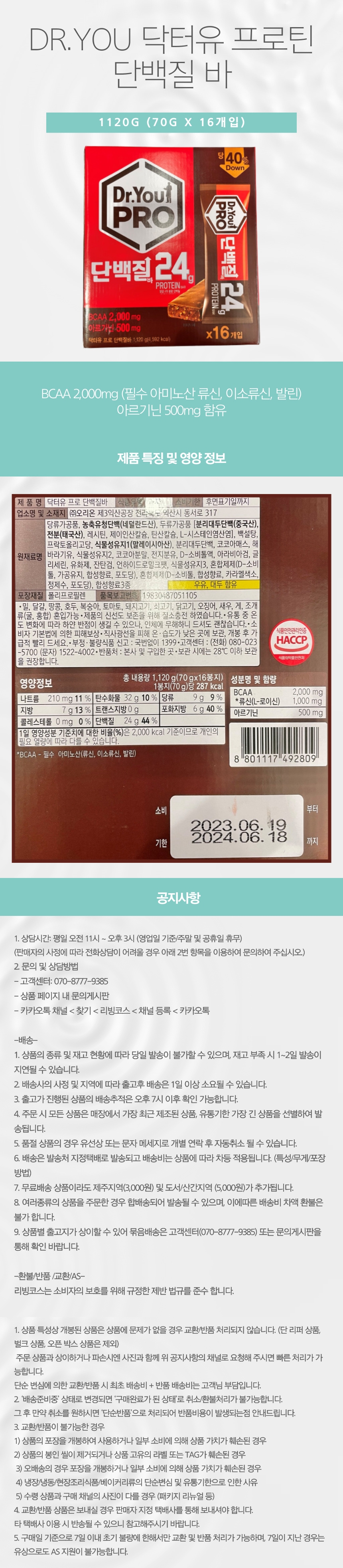 DR.YOU 닥터유 프로 단백질 바 1120G (70G X 16개입) COS