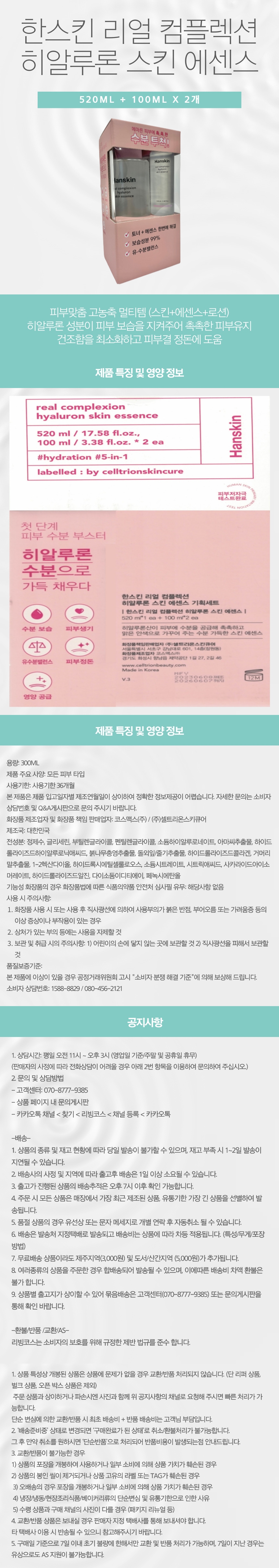 한스킨 리얼 컴플렉션 히알루론 스킨 에센스 520ML + 100ML X 2개 COSBESTMDHOT