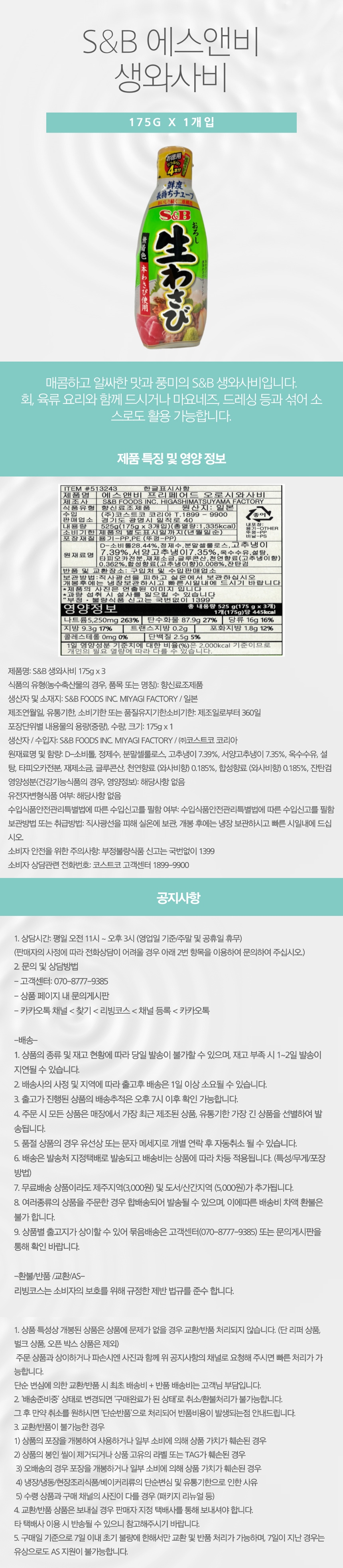 D-소비톨, 정제수, 분말셀룰로스, 고추냉이 7.39%, 서양고추냉이 7.35%, 옥수수유, 설탕, 타피오카전분, 재제소금, 글루콘산, 천연향료 (와사비향) 0.185%, 합성향료 (와사비향) 0.185%, 잔탄검
