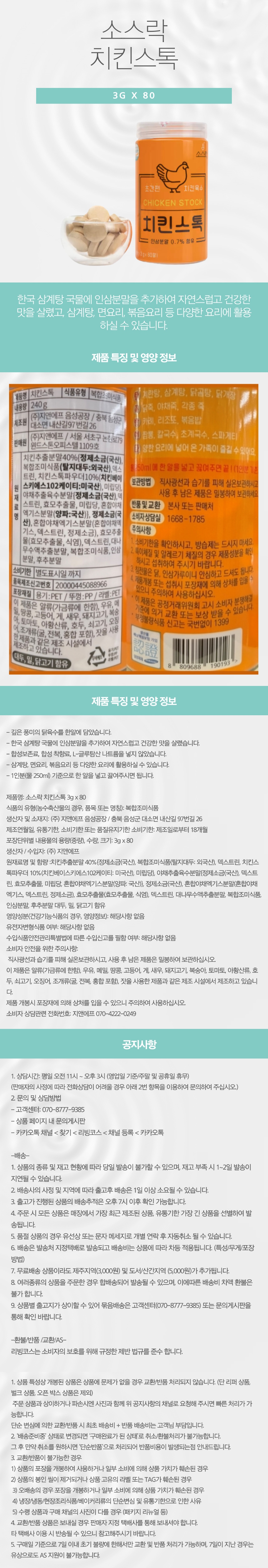 치킨추출분말 40%{정제소금(국산), 복합조미식품(탈지대두: 외국산), 덱스트린, 치킨스톡파우더 10%(치킨베이스키에스102케이티: 미국산), 미립당}, 야채추출육수분말{정제소금(국산), 덱스트린, 효모추출물, 미립당, 혼합야채엑기스분말(양파: 국산)}, 정제소금(국산), 혼합야채엑기스분말(혼합야채엑기스, 덱스트린, 정제소금), 효모추출물(효모추출물, 식염), 덱스트린, 대나무수액추출분말, 복합조미식품, 인삼분말, 후추분말 대두, 밀, 닭고기 함유