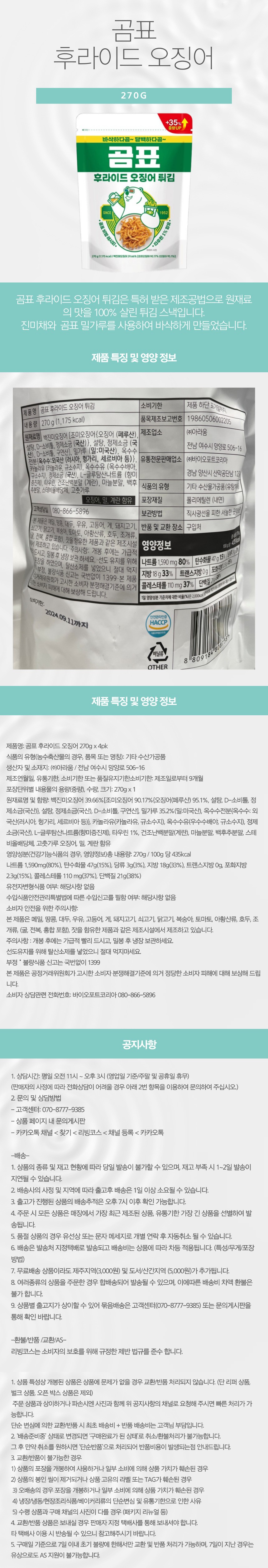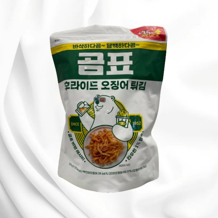 백진미오징어 39.66%[조미오징어 90.17%{오징어(페루산) 95.1%, 설탕, D-소비톨, 정제소금(국산)}, 설탕, 정제소금(국산), D-소비톨, 구연산], 밀가루 35.2%(밀:미국산), 옥수수전분{옥수수: 외국산(러시아, 헝가리, 세르비아 등)}, 카놀라유(카놀라유, 규소수지), 옥수수유(우수수배야, 규소수지), 정제소금(국산), L-글루탐산나트륨(향미증진제), 타우린 1%, 건조난백분말(계란), 마늘분말, 백후추분말, 스테비올배당체, 고춧가루 오징어, 밀, 계란 함유