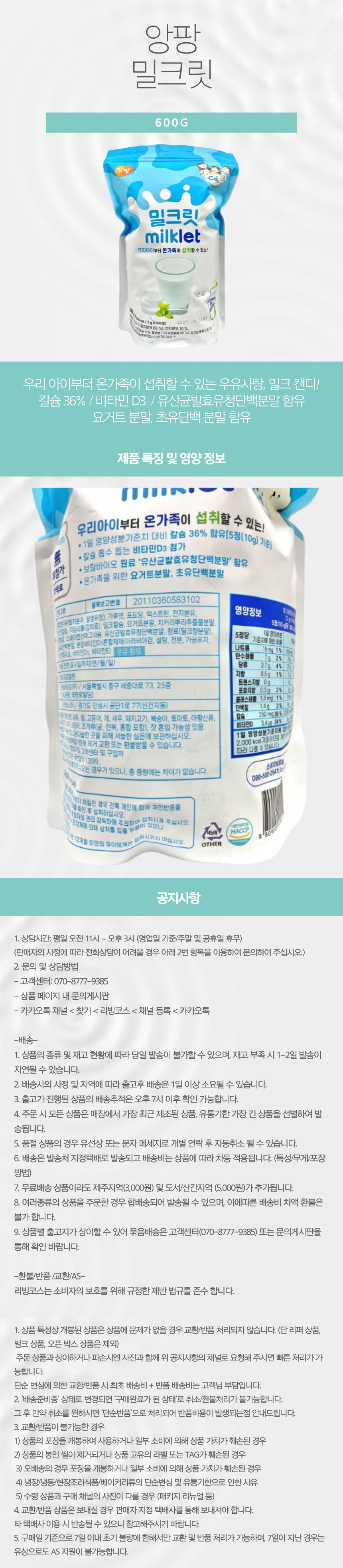 혼합분유(탈지분유, 탈염유청), 가루엿, 포도당, 덱스트린, 전지분유, 탄산칼슘, 자일리톨(감미료), 밀크칼슘, 요거트분말, 치커리뿌리추출물분말, 꿀분말, 스테아린산마그네슘, 유산균발효청단백분말, 향료(밀크향분말), 초유단백분말, 분말비타민D3혼합제제(아라비아검, 설탕, 전분, 가공유지, 이산화규소, 비타민D3, 비타민E), 우유 함유