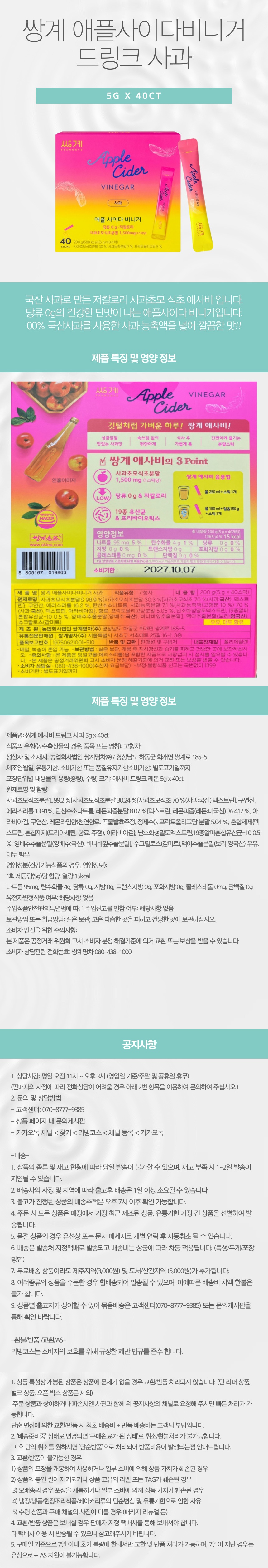 쌍계 애플 사이다 비니거 드링크 사과맛 5G X 40 사과초모식초분말 믹스 COS