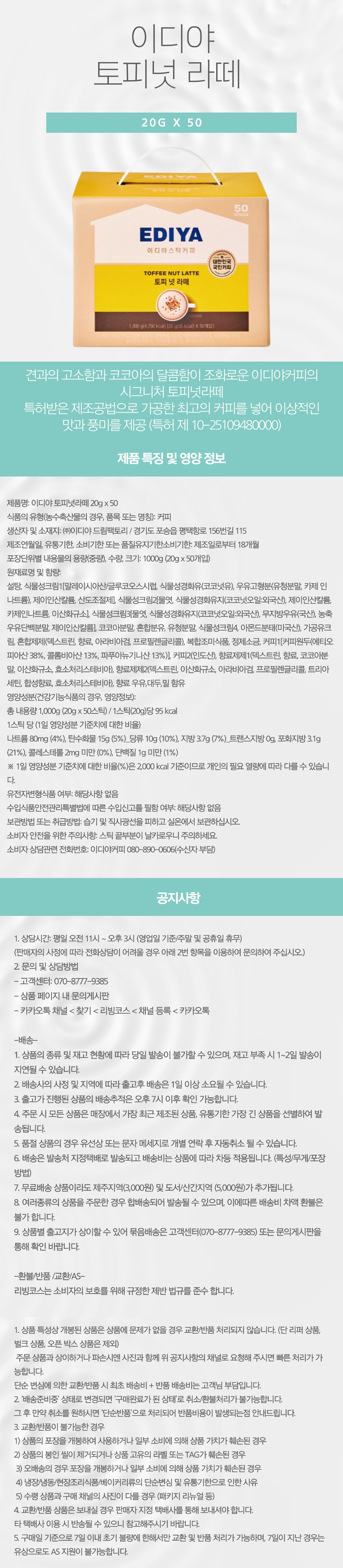 - 국내 커피전문점의 자존심 이디야커피의 시그니처 토피넛 라떼를 매장에서의 맛을 그대로 구현하였습니다. 특허받은 제조공법으로 가공한 최고의 커피를 넣어 이상적인 맛과 풍미를 제공합니다. (특허 제 10-25109480000)