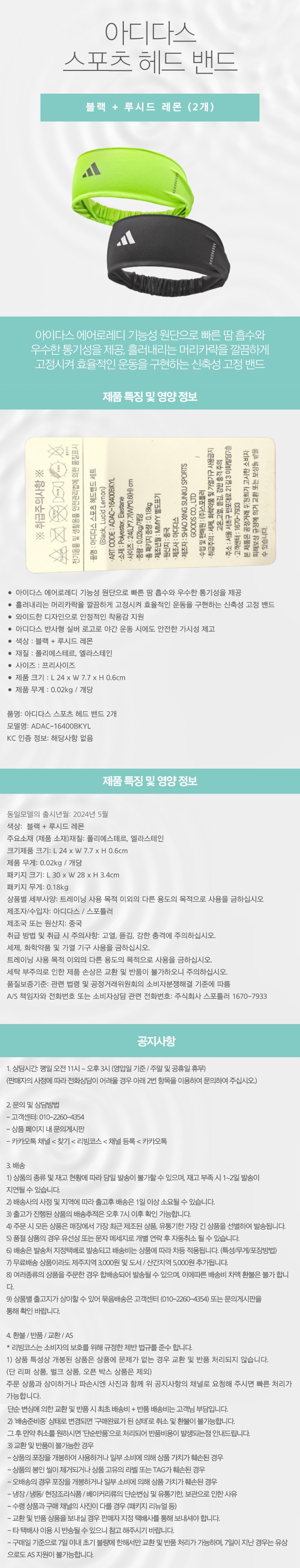 아디다스 스포츠 헤드 밴드 2개 / ADAC-16400BKYL