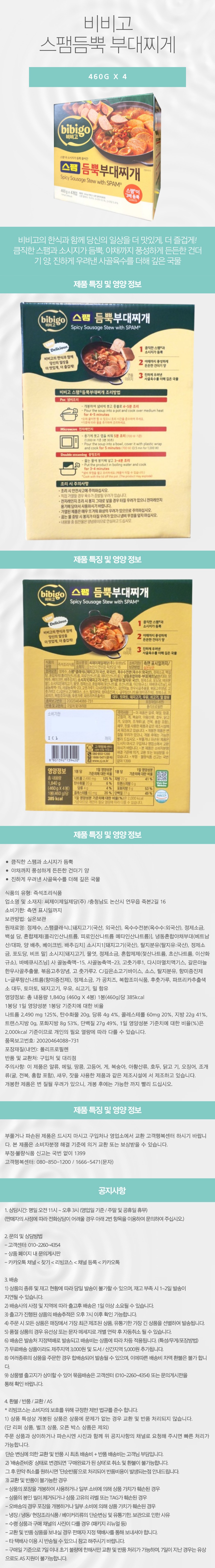 - 비비고의 인기 즉석 찌개 제품으로, 스팸과 다양한 재료가 풍성하게 들어간 부대찌개입니다.