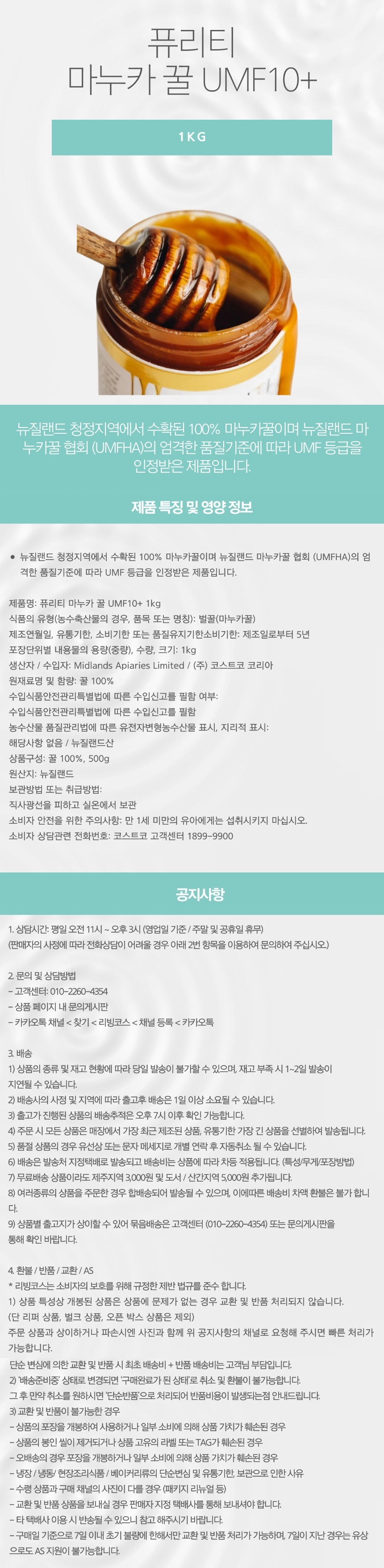 퓨리티 마누카 꿀 UMF10+ 1kg