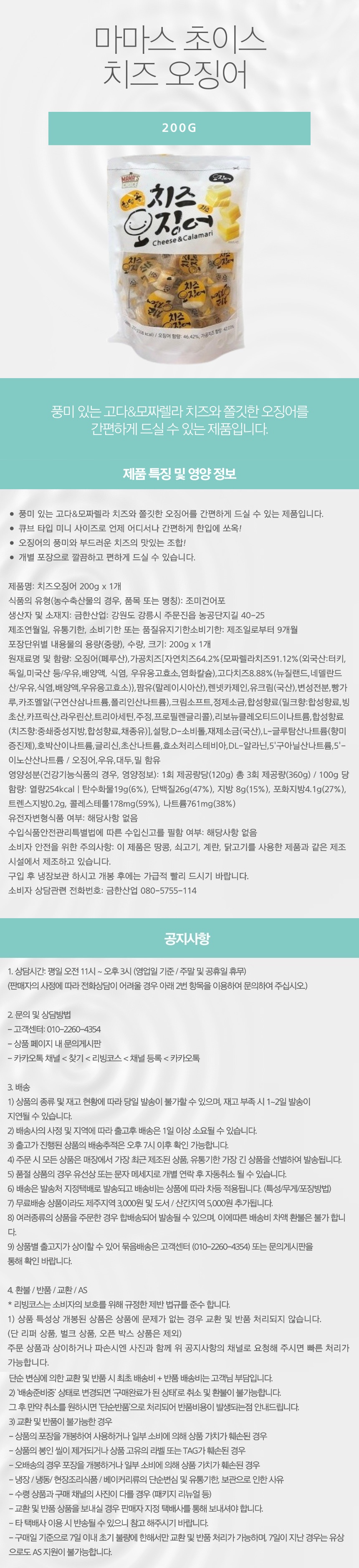 오징어(페루산),가공치즈[자연치즈64.2%{모짜렐라치즈91.12%(외국산:터키,독일,미국산 등/우유,배양액, 식염, 우유응고효소,염화칼슘),고다치즈8.88%(뉴질랜드,네델란드 산/우유,식염,배양액,우유응고효소)},팜유(말레이시아산),렌넷카제인,유크림(국산),변성전분,빵가루,카조멜알(구연산삼나트륨,폴리인산나트륨),크림소프트,정제소금,합성향료(밀크향:합성향료,빙초산,카프릭산,라우린산,트리아세틴,주정,프로필렌글리콜),리보뉴클레오티드이나트륨,합성향료(치즈향:중쇄중성지방,합성향료,채종유)],설탕,D-소비톨,재제소금(국산),L-글루탐산나트륨(향미증진제),호박산이나트륨,글리신,초산나트륨,효소처리스테비아,DL-알라닌,5'구아닐산나트륨,5'-이노산산나트륨
