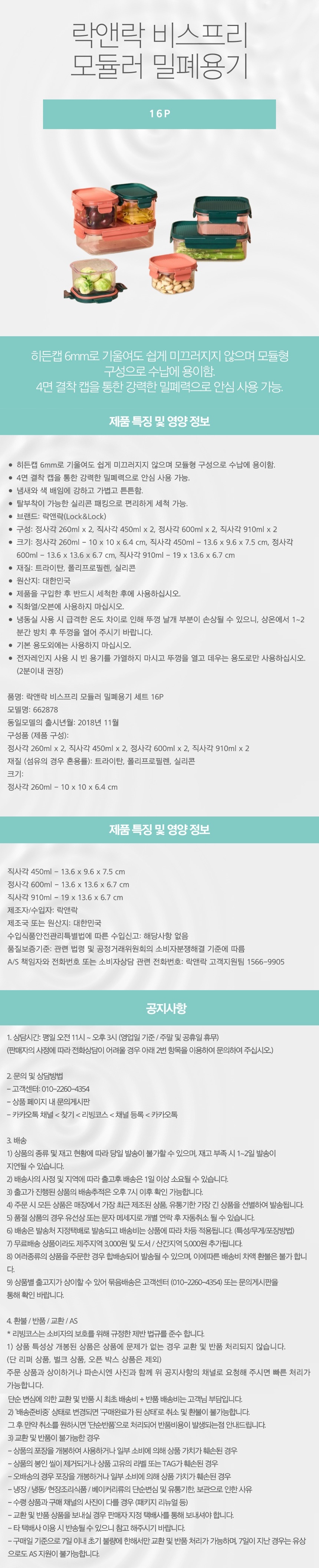 - 크기: 정사각 260ml - 10 x 10 x 6.4 cm, 직사각 450ml - 13.6 x 9.6 x 7.5 cm, 정사각 600ml - 13.6 x 13.6 x 6.7 cm, 직사각 910ml - 19 x 13.6 x 6.7 cm