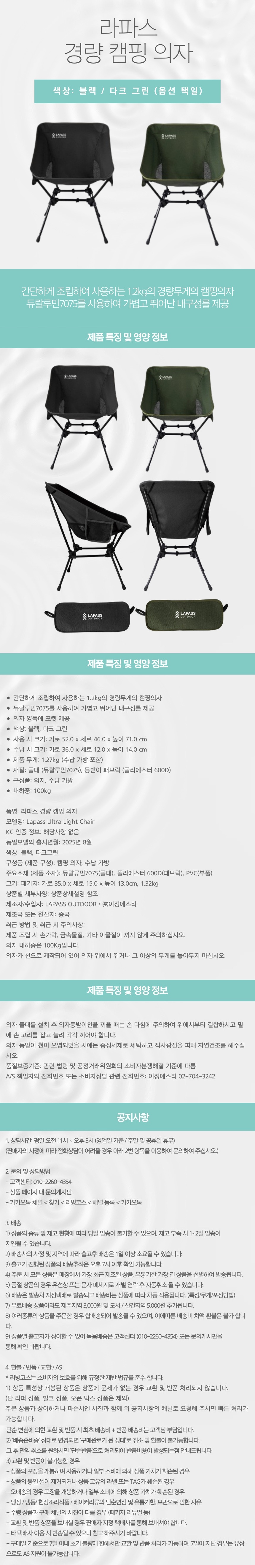 - 재질: 폴대 (듀랄루민7075), 등받이 패브릭 (폴리에스터 600D)