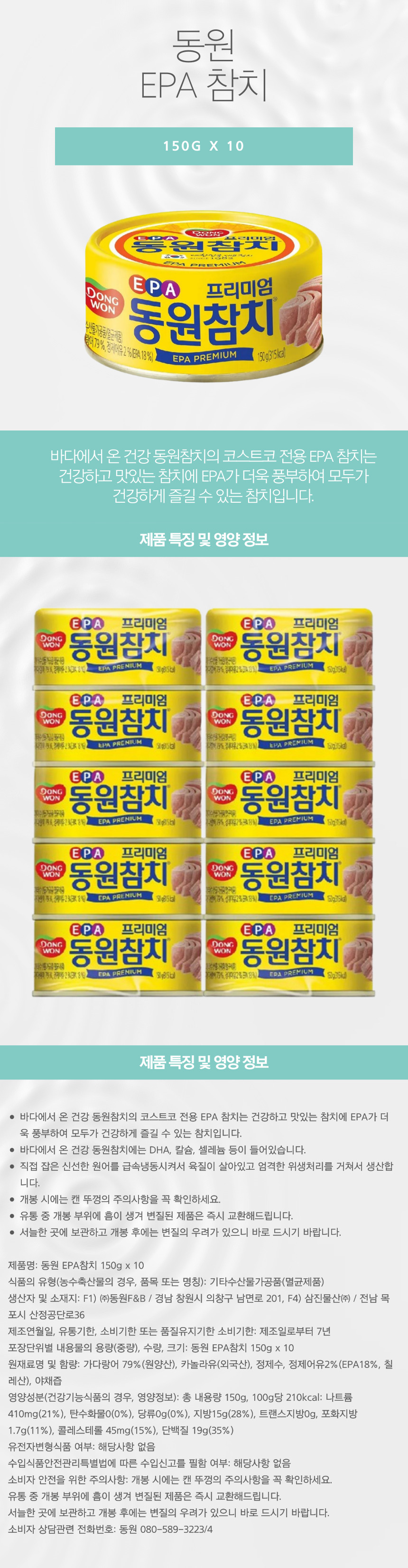 - 바다에서 온 건강 동원참치의 코스트코 전용 EPA 참치는 건강하고 맛있는 참치에 EPA가 더욱 풍부하여 모두가 건강하게 즐길 수 있는 참치입니다.