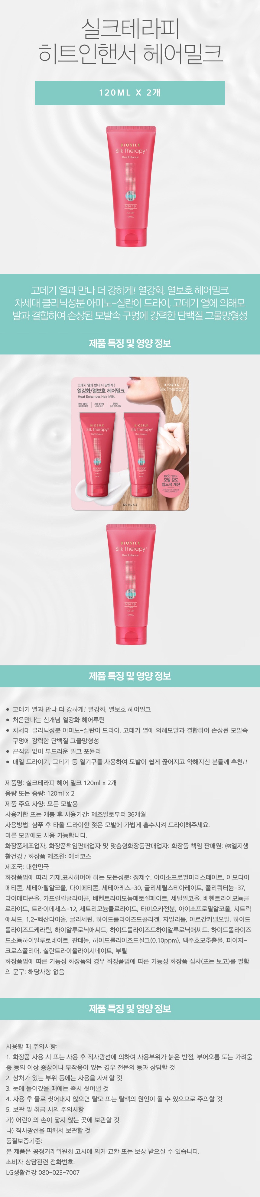 - 제품 구성: 실크테라피 히트인핸서 헤어밀크 120mL x 2입