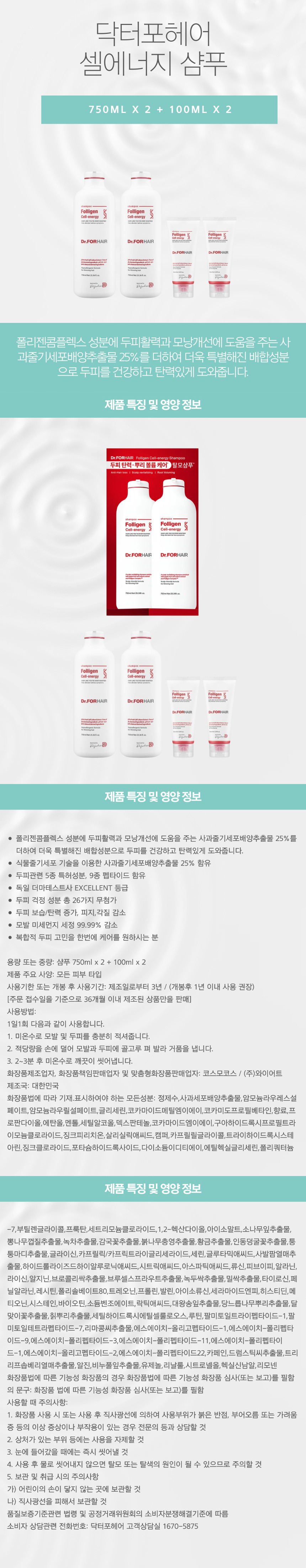 - 폴리젠콤플렉스 성분에 두피활력과 모낭개선에 도움을 주는 사과줄기세포배양추출물 25%를 더하여 더욱 특별해진 배합성분으로 두피를 건강하고 탄력있게 도와줍니다.