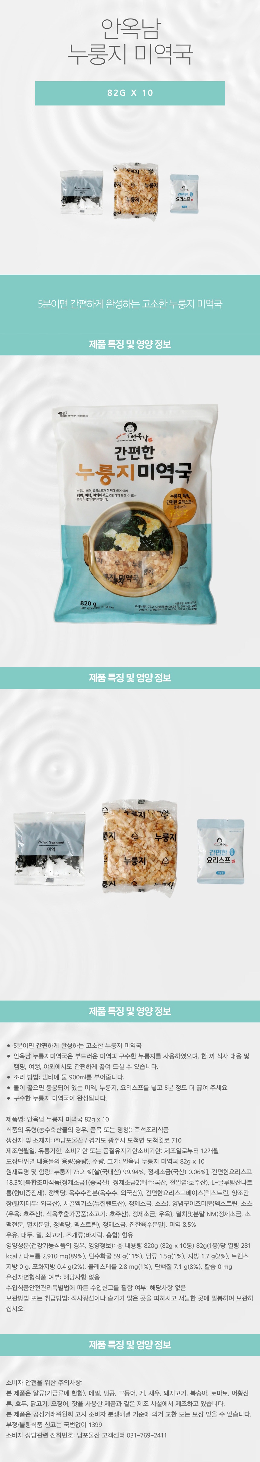 - 안옥남 누룽지미역국은 부드러운 미역과 구수한 누룽지를 사용하였으며, 한 끼 식사 대용 및 캠핑, 여행, 야외에서도 간편하게 끓여 드실 수 있습니다.